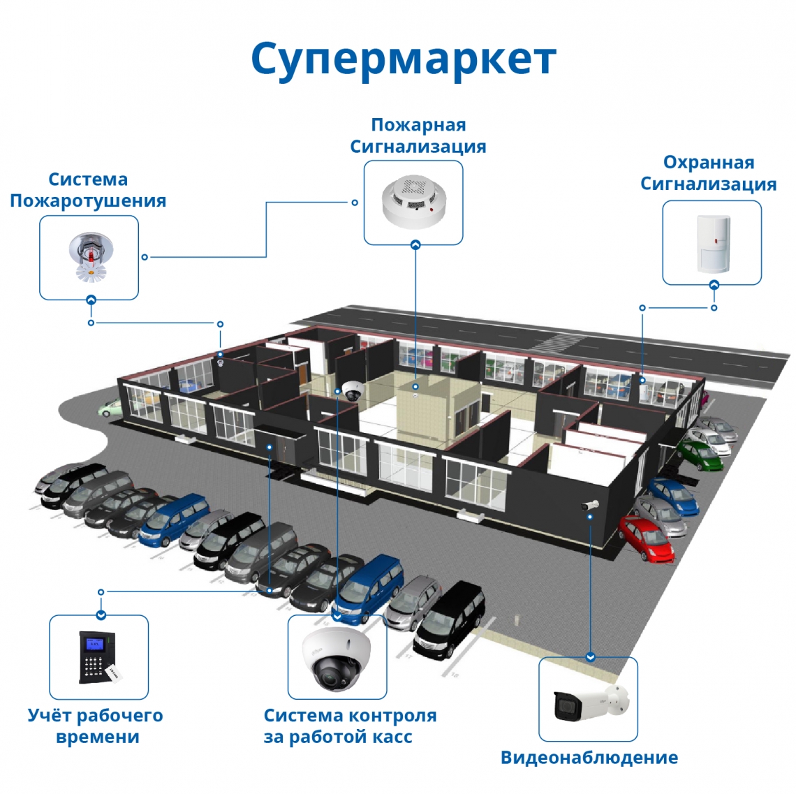Современная охранная система торгового предприятия состоит из целого комплекса технических устройств, препятствующих незаконному проникновению на территорию и краже товара. Периметр предприятия, склады, подсобные помещения и прилегающая территория находятся под постоянным контролем датчиков движения. Ряд специализированных устройств размещается в торговом зале с целью противодействия кражам и оперативной передачи тревожного сигнала в случае противоправных действий. При возникновении опасной ситуации персонал может воспользоваться скрытой тревожной кнопкой, по сигналу которой прибывает оперативная группа. Некоторые из систем охранной сигнализации могут управляться удалённо посредством мобильного приложения.